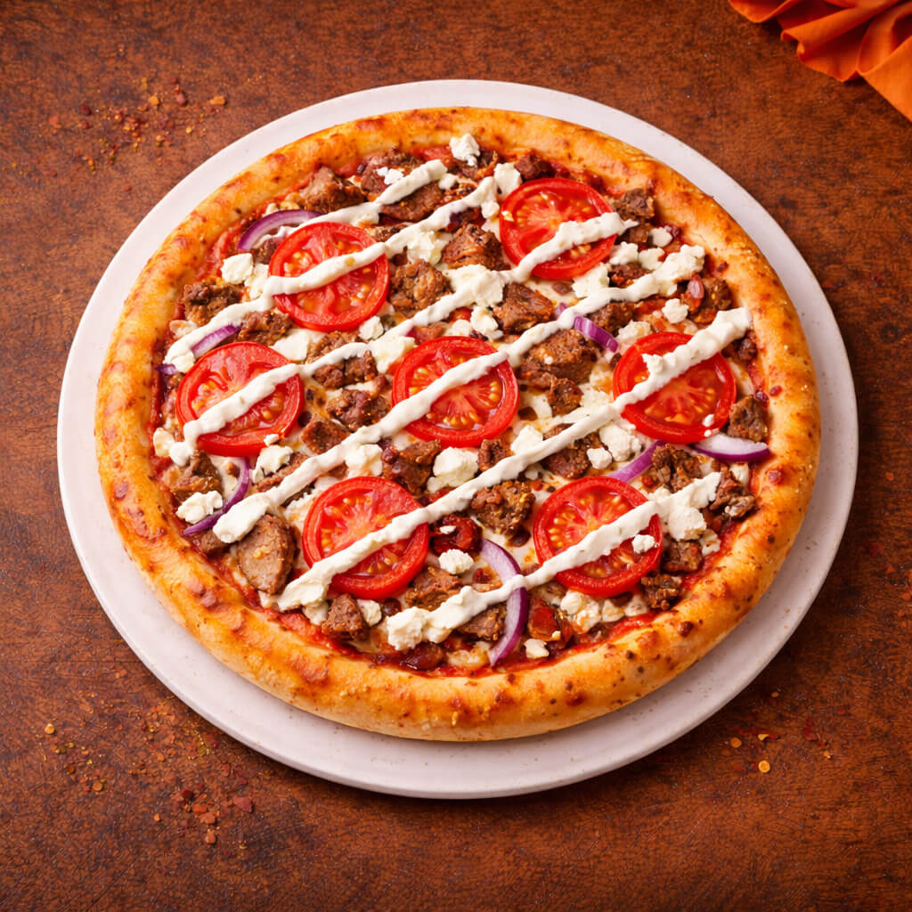 Our catering pizzas are designed for group orders and events. The Gyro Pizza features seasoned gyro meat, tomatoes, red onions, mozzarella cheese, and creamy tzatziki sauce, creating a bold and unique flavor combination. Perfect for parties and gatherings.